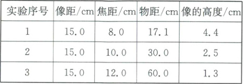 (填操作步骤),再调节“F”光源到凸透镜的距离,直到光屏上成清晰的像,分别记录焦距、物距和像的高度。(3)实验数据如表所示,物体高度H=5.0 cm。