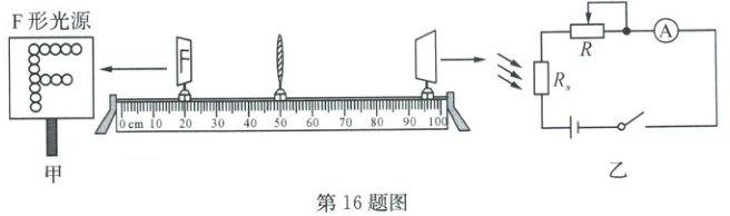 在光屏中间区域加一个光敏电阻 $R_x$(电阻大小随光照强度变化如表所示)。$R_x$ 受到的光照越强,则说明所成的像越清晰。电路如图乙所示,电源电压为 $4.5V$,电流表量程为 $0 \sim 0.6A$。