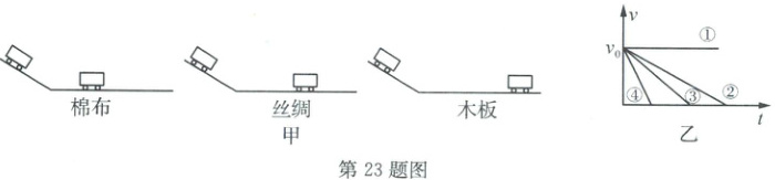23. (4 分)小明为模仿伽利略斜面实验“探究阻力对物体运动的影响”(如图甲),让同一辆小车从同一斜面分别滑到铺有棉布、丝绸和未铺任何材料的水平木板上,观察并记录小车水平滑行的距离。(不计空气阻力)
