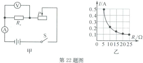 22. 小嘉利用如图甲所示的电路研究电流、电压、电阻之间的关系,电源电压恒为 3 V,实验中小嘉更换了 5 Ω、10 Ω、15 Ω、20 Ω、25 Ω 共 5 个定值电阻 $ R_x $,得到如图乙所示的图像。