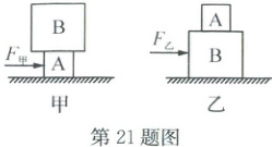 21. 如图,实心正方体 A、B 的材质与表面粗糙程度均相同,且 $ m_A : m_B = 1 : 8 $,A、B 叠放于水平地面上,在水平推力 F 的作用下一起向右匀速直线运动。