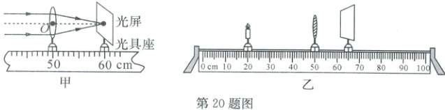 20. 在做“探究凸透镜成像规律”的实验中,平行于主光轴的光线经凸透镜后会聚在光屏上一点,如图甲所示。