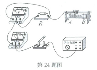 24. 在探究“电流与电阻的关系”实验中,小科利用如图所示实验器材进行实验,其中电源电压恒为 6 V,电阻 R 的阻值分别为 5 Ω、10 Ω、15 Ω、30 Ω。