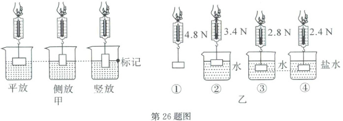 (1) 小科先后将一长方体金属块平放、侧放和竖放系在弹簧测力计上,使其部分浸入同一杯水中,保证每次水面到达同一标记处,如图甲所示,比较弹簧测力计示数大小。小科上述操作是想验证猜想