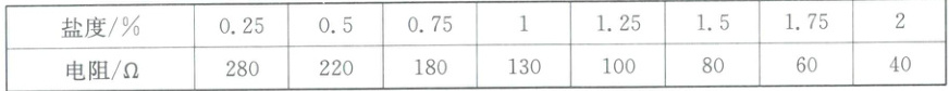 【数据调试】20℃时,铜片间距离为 10 cm 时,测得卤水的电阻大小与盐度的关系如表所示。