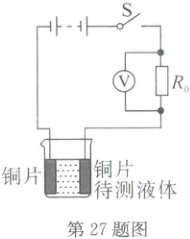 27. 酱鸭是杭州的一道特色名吃,调查发现,酱鸭制作过程中需要用卤水(食盐溶液)腌制,且卤水的盐度(溶质质量分数)保持在 1.5%~1.6%时风味最佳。某项目小组制作了量程为 0%~2%的盐度计,用于测量卤水盐度,项目实施如下。