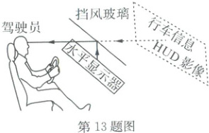 13. (2025·德清)为了避免汽车在高速行驶时,驾驶员低头观看仪表信息造成事故,目前许多汽车都配备了抬头显示器(简称HUD),如图所示是HUD成像的原理示意图。将水平显示器上的重要行车数据通过前挡风玻璃反射呈现在前方,增强驾驶安全。下列说法不正确的是(
