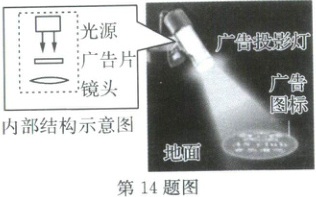 14. (2025·东阳)如图所示为商场门口的广告投影灯及其内部结构,它主要由光源、广告片和焦距为f的凸透镜组成,下列说法正确的是(