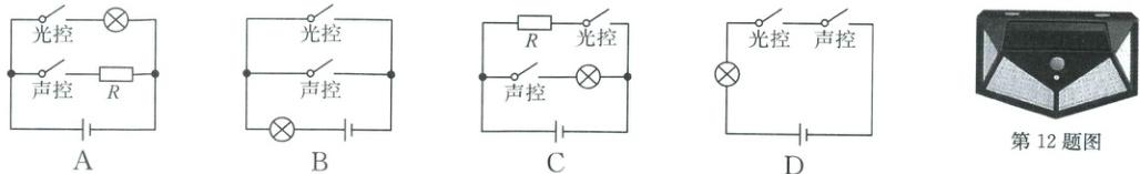 12. 如图是一款太阳能户外庭院照明灯,内含声控和光控两个开关。可以实现白天阳光下充电,有人走过发出声音时灯也不亮,夜晚有人走过发出声音时灯立刻就亮。下列电路图中,属于该种庭院灯电路的是(