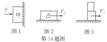 14. 图 1 是物体甲在力 F₁ 的作用下静止在竖直墙面上;图 2 是物体乙在拉力 F₂ 的作用下在水平面上做匀速直线运动;图 3 是把物体乙沿竖直方向切下一部分,置于另一部分上面,在拉力 F₃ 的作用下,在原水平面上做匀速直线运动。则下列说法中正确的是(