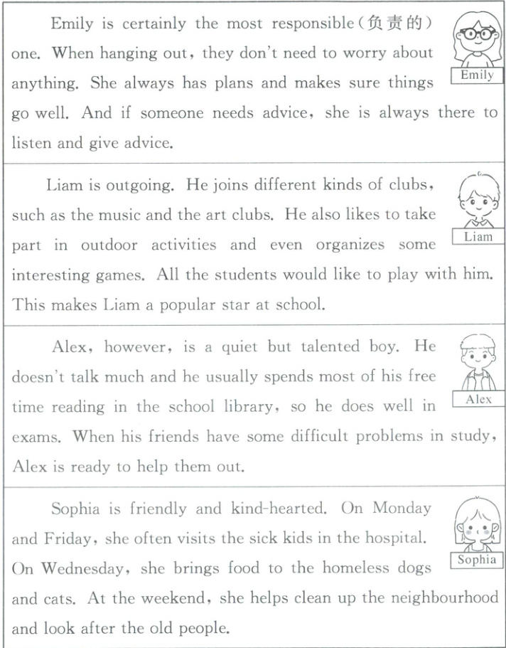In the hallway of Lincoln High School,Emily,Alex,Liam,and Sophia are talking and laughing happily. Though they have very different characters,they are good friends.