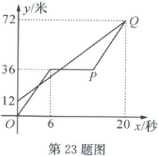23. (10 分)为响应国家“发展新一代人工智能”的号召,某市举办了无人机大赛。甲无人机从地面起飞,乙无人机从距离地面 12 米高的升降平台起飞,甲、乙两架无人机同时匀速上升,6 秒时甲无人机到达大赛指定的高度停止上升开始表演,完成表演动作后,按原速继续飞行上升,当甲、乙两架无人机按照大赛要求同时到达距离地面的高度为 72 米时,进行联合表演。甲、乙两架无人机所在的位置距离地面的高度 $y$(米)与飞行的时间 $x$(秒)之间的函数关系如图所示,请根据图象回答下列问题: