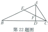 22. (10 分)如图,$AD$ 是 $\triangle ABC$ 的高线,$E$ 为 $AB$ 上一点,连结 $CE$,交 $AD$ 于点 $F$,$BE = CE$。