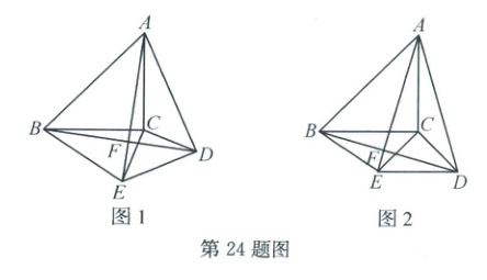 24. (12 分)如图 1,$\triangle ABC$ 和 $\triangle CDE$ 都是等腰直角三角形,$\angle ACB = \angle DCE = 90°$,$D$ 为 $\triangle ABC$ 外一点,$AB > 2CD$,点 $A,C,E$ 三点不共线,连结 $AD,AE,BD,BE$,$AE$ 与 $BD$ 交于点 $F$。