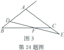 (2)如图3,在△ABC中,AB=AC,点D在射线BA上运动,点E在AC的延长线上,且BD=CE,连结DE交BC所在的直线于点F。