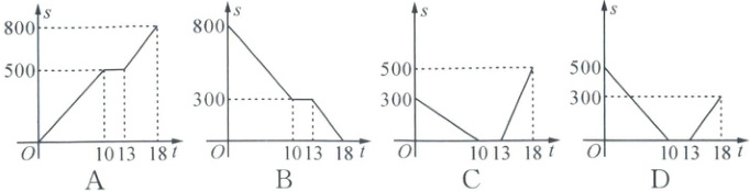 8. 小温的家、图书馆、学校依次在同一直线上,他从学校出发匀速步行 10 分钟走了 500 米到图书馆,停留 3 分钟后再匀速步行 5 分钟走了 300 米到家。设小温离家的距离为 $ s $(米),所用时间为 $ t $(分钟),则下列图象中,能近似刻画 $ s $ 与 $ t $ 之间关系的是(