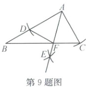 9. 如图,在 $ \angle ABC $ 中, $ \angle BAC = 90^{\circ} $, $ \angle B = 30^{\circ} $。以 $ A $ 为圆心, $ AC $ 为半径画弧交 $ AB $ 于点 $ D $;分别以 $ C,D $ 为圆心,大于 $ \frac{1}{2}CD $ 的长为半径画弧交于点 $ E $,射线 $ AE $ 交 $ BC $ 于点 $ F $,连结 $ DF $,则 $ \angle AFD $ 的度数为(