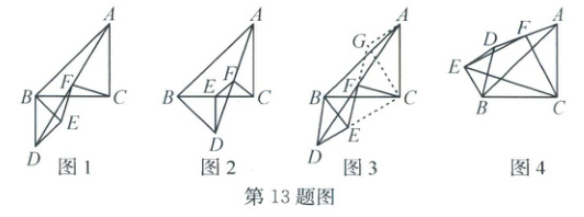 13.(2024·舟山定海)小王同学在学习完第2章《特殊三角形》后,剪了两张等腰直角三角形纸片,并将锐角顶点叠合放置成如图1所示图形,其中$\angle ACB = \angle BED = 90^{\circ}$,$CA = CB$,$EB = ED$,连结$AD$后取中点$F$,再连结$FE$和$FC$。探究$FE$与$FC$的位置及数量关系。