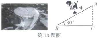 13. (2025·杭州钱塘)钱塘轮滑中心为杭州第19届亚运会轮滑、滑板比赛场馆,由亚运轮滑馆和亚运滑板公园两部分组成。如图,一名轮滑学生在轮滑训练馆沿着倾斜角为$30^{\circ}$的斜坡,从$A$滑行至$B$,若$AB = 4$米,则这名轮滑学生的高度下降了