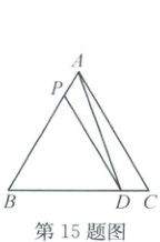 15. (2025·义乌)如图,在等边$\triangle ABC$中,$D$是$BC$边上固定一点,$P$是$AB$边上一动点,连结$AD$,$PD$。当$AP = 1$时,$PD = BD$,当$AP = 3$时,$PD$有最小值。所以线段$AD$的长为