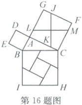 16.$\frac{3}{2}$ 解析:因为AB=2,BC=$\sqrt{29}$,所以AC=5。因为JK=LM=BC=$\sqrt{29}$,所以$\frac{1}{2}$LM=$\frac{\sqrt{29}}{2}$。如图,连结LK,设LM,JK的交点为O,因为LG=AK,AL² +AK²=LO²+OK²=2×($\frac{\sqrt{29}}{2}$)²,解得AL=$\frac{3}{2}$或$-\frac{7}{2}$(舍去)。所以AL=$\frac{3}{2}$。