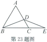 23. (8分)(2025·宁波海曙)如图,在等边三角形$ABC$中,$D$是$AC$边上的一点,$E$是$BC$延长线上的一点,且$AD = CE$。