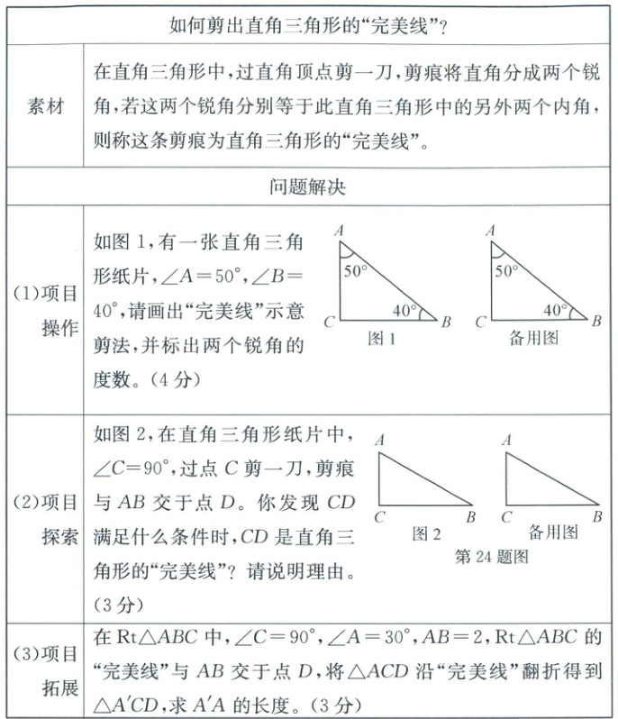 (2)解:CD为中线或垂线时,CD是直角三角形的“完美线”。理由如下:①若∠ACD=∠DAC,∠DCB=∠ABC,则AD=CD=BD,即CD为中线;②若∠ACD=∠ABC,则∠ABC+∠DCB=∠DCB+∠ACD=90°,所以∠CDB=90°,即CD为垂线。