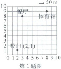 1. (2024·龙游、江山、开化)如图,已知校门的位置是 $ (2,1) $,则体育馆的位置为