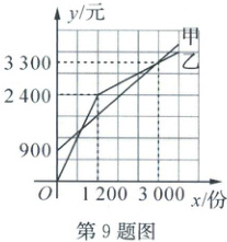 9.解:目标1:设$y_{甲}$关于$x$的函数表达式为$y_{甲} = kx + b$。由图象可知,直线$y_{甲}$经过$(0,900)$,$(3000,3300)$,得