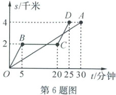 6.(2024·嘉兴)小明和爸爸两人从相距 4 千米的甲地前往乙地,两人同时出发,小明骑自行车,爸爸骑电瓶车。如图,线段 $ OA $、折线 $ OBCD $ 分别表示小明和爸爸距离甲地路程 $ s $(千米)与时间 $ t $(分钟)之间的函数关系。下列说法正确的是(