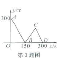 3. (2025·龙泉)甲、乙两人骑自行车匀速同向行驶,乙在甲前面300(m)处,同时出发去距离甲1200(m)的目的地,甲的速度比乙快。设甲、乙之间的距离为$ y $(m),乙行驶的时间为$ x $(s),$ y $与$ x $之间的关系如图所示,则点$ C $的坐标为 (