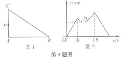 4. (2024·龙游、江山、开化)如图1,在$ Rt \triangle ABC $中,$ \angle A = 90 ^ { \circ } $,点$ P $从点$ A $出发,沿三角形的边$ AC - CB - BA $以1 cm/s的速度运动,图2是点$ P $运动时,线段$ AP $的长度$ y $(cm)随运动时间$ x $(s)变化的图象。若点$ D $是曲线的最低点,则点$ D $的纵坐标为 (