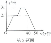 2. (2025·兰溪、浦江)周末小明从家出发跑步去健身主题公园,中途休息一段时间,到达健身公园后又再次休息,之后跑步返回家中,已知小明两次休息时间相同且跑步速度始终不变。小明离开家的路程$ s $(米)与时间$ t $(分钟)的关系(部分数据)如图所示。小明每次休息的时间为 (