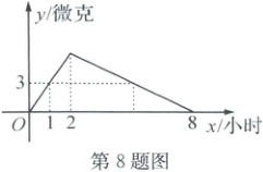 8. (2025·嵊州)某医药研究所研发了一种新药,在实验药效时发现,如果按规定剂量服用,每毫升血液中含药量$ y $(微克)随时间$ x $(小时)的变化情况如图所示,那么当按规定剂量服药后,根据图象回答下列问题: