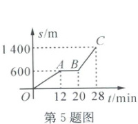 5. (2024·杭州西湖)如图,图中的折线$ OABC $反映了圆圆从家到学校所走的路程$ s $(m)与时间$ t $(min)的函数关系,其中,$ OA $所在直线的表达式为$ y = k _ { 1 } x ( k _ { 1 } \neq 0 ) $,$ BC $所在直线的表达式为$ y = k _ { 2 } x + b ( k _ { 2 } \neq 0 ) $,则$ k _ { 2 } - k _ { 1 } = $
