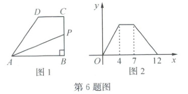 6. (2024·新昌)如图1,在四边形$ ABCD $中,$ AB // CD $,$ AB \perp BC $,动点$ P $从点$ B $出发,沿$ B \to C \to D \to A $的方向运动,到达点$ A $停止。设点$ P $的运动路程为$ x $,$ \triangle ABP $的面积为$ y $,如果$ y $与$ x $的函数图象如图2所示,那么$ AB $边的长度为