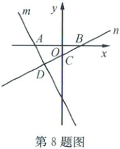 8. (2024·丽水莲都)如图,直线 $ m $ 的函数表达式为 $ y = - 2 x - 6 $,与 $ x $ 轴交于点 $ A $,直线 $ n $ 经过点 $ B ( 2, 0 ) $ 和点 $ C ( 0, - 1 ) $,且直线 $ m,n $ 交于点 $ D $。