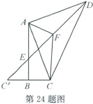24. (8 分)如图,已知$\triangle ABC$和$\triangle ACD$,$\angle ABC = \angle CAD = 90^{\circ}$,$AC = AD$,$AB > BC$,点$C$关于直线$AB$的对称点为$C'$,线段$C'D$交边$AB$于点$E$,交$\angle CAD$的平分线于点$F$,连结$CF$。