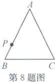 8. 如图,在 $ \triangle ABC $ 中,$ AB = AC,\angle A = 52^{\circ} $,$ P $ 是边 $ AB $ 上的一个动点,则 $ \angle APC $ 的度数可能是(