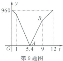 9. 快车从甲地匀速开往乙地,慢车从乙地出发沿同一条公路匀速前往甲地。慢车先出发 1 小时,快车再出发。设慢车行驶的时间为 $ t $ 小时,两车之间的距离为 $ y $ 千米,$ y $ 与 $ t $ 的函数关系如图所示。下列结论:①快车出发 4.4 小时后两车相遇;②慢车的速度是 $ 100 千米/时 $;③线段 $ AB $ 所在直线的函数表达式为 $ y = 200t - 1080 $,正确的有(