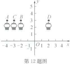 12. 如图,四盏灯笼 $ A,B,C,D $ 的坐标分别是 $ (-4,b),(-2,b),(-3,b),(2,b) $,要使四盏灯笼组成的图形关于 $ y $ 轴对称,只需把灯笼 $ C $ 向右平移