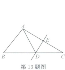 13. 如图,在 $ \triangle ABC $ 中,边 $ AC $ 的垂直平分线交 $ AC $ 于点 $ E $,交 $ BC $ 于点 $ D $,若 $ AB = 6 $,$ \triangle ABD $ 的周长为 18,则 $ BC $ 的长为