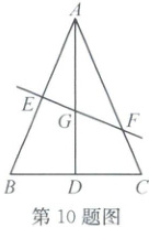 10. 如图,在 $ \triangle ABC $ 中,$ AB = AC $,$ AD $ 是 $ BC $ 边上的高线,$ EF $ 垂直平分 $ AB $,分别交 $ AB,AC,AD $ 于点 $ E,F,G $。若 $ \angle BAC = 45^{\circ} $,$ EG = 1 $,则 $ CF = $(