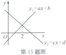 15. 一次函数 $ y_{1} = ax + b $ 与 $ y_{2} = cx + d $ ($ a $,$ b $,$ c $,$ d $ 为常数,$ a \neq 0 $,$ c \neq 0 $)的图象如图所示,若 $ a - c = m(d - b) $,则 $ m = $