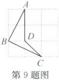9. 如图,在 $ 3×3 $ 的正方形网格中,点 $ A $,$ B $,$ C $,$ D $ 均为格点,顺次连结 $ AB $,$ BC $,$ CD $,$ DA $,则下列说法正确的是(