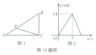 16. 如图 1,在 $ \triangle ABC $ 中,$ \angle ACB = 90^{\circ} $,点 $ P $ 从点 $ A $ 出发沿 $ A \to B \to C $ 以 $ 1 $ $ cm/s $ 的速度匀速运动至点 $ C $,图 2 是点 $ P $ 运动时,$ \triangle ACP $ 的面积 $ y (cm^{2}) $ 随时间 $ x(s) $ 变化的函数图象,则 $ \triangle ABC $ 的面积为