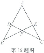 19. (8 分)如图,在 $ \triangle ABE $ 和 $ \triangle ACD $ 中,$ AB = AC $,点 $ D $,$ E $ 分别在边 $ AB $,$ AC $ 上,$ BE $ 与 $ CD $ 交于点 $ F $。有以下四个条件:① $ \angle BDC = \angle CEB $;② $ BE = CD $;③ $ AD = AE $;④ $ \angle B = \angle C $。请你从中任选一个条件,使得 $ \triangle ABE \cong \triangle ACD $,并说明理由。