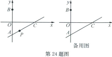 24. (8 分)如图,在平面直角坐标系中,已知点$A(0,-4)$,$B(0,4)$,直线$AC$与$x$轴交于点$C$,$\angle BAC = 60^{\circ}$,$P$为直线$AC$上一动点。
