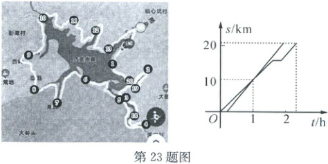 23. (10 分) 热门的巧英水库环湖跑结束后,小宇和爸爸相约从同一地点,沿同一路线环湖再跑一圈(环湖跑一圈总路程为 $21\ km$,假设小宇和爸爸在整个跑步过程中匀速前进),爸爸跑得慢,先出发,$10\ min$ 后,小宇再出发,中途爸爸停下来接了个电话后继续以原来的速度前进,比小宇晚 $23\ min$ 到达终点。两人离开出发点的路程 $s(km)$ 与爸爸离开出发点的时间 $t(h)$ 的函数图象如图所示。