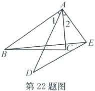 22. (10 分) 如图,在 $\triangle ABC$ 和 $\triangle ADE$ 中,$\angle 1 = \angle 2$,$\angle ABC = \angle D$,$AB = AD = 5$,$AC = 3$。